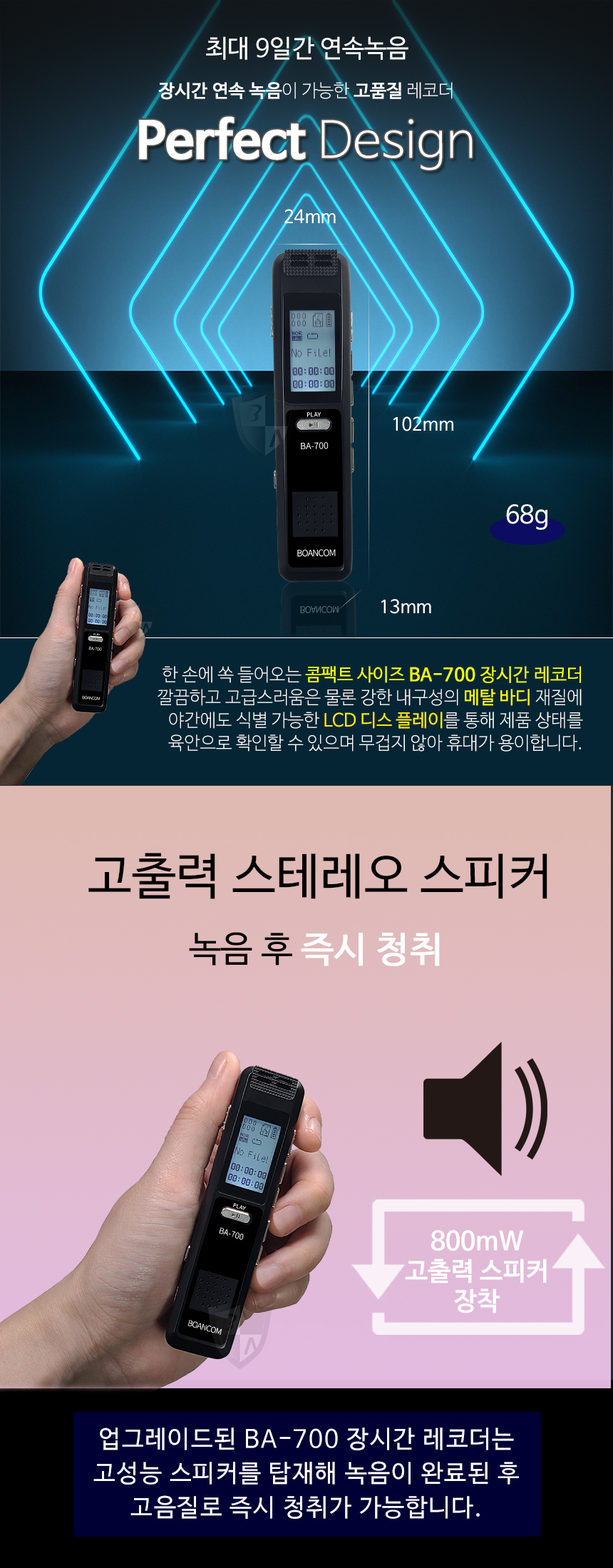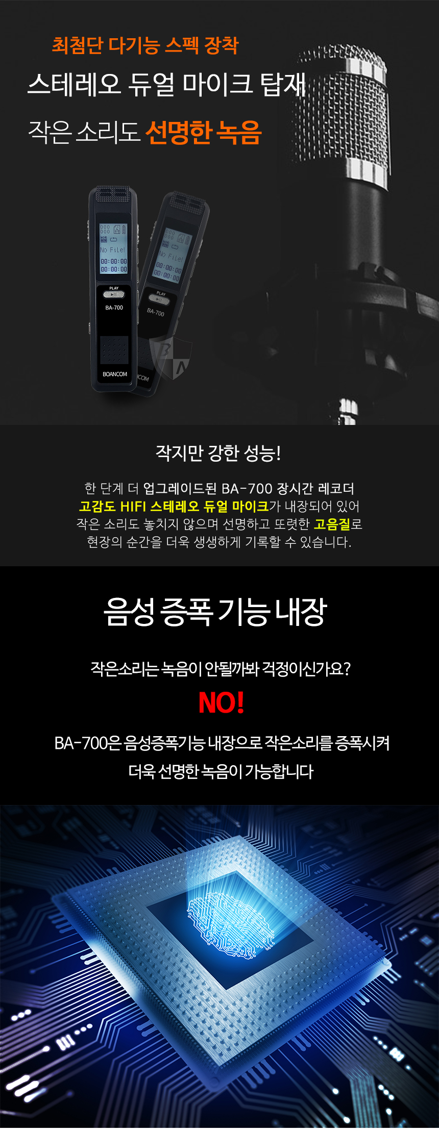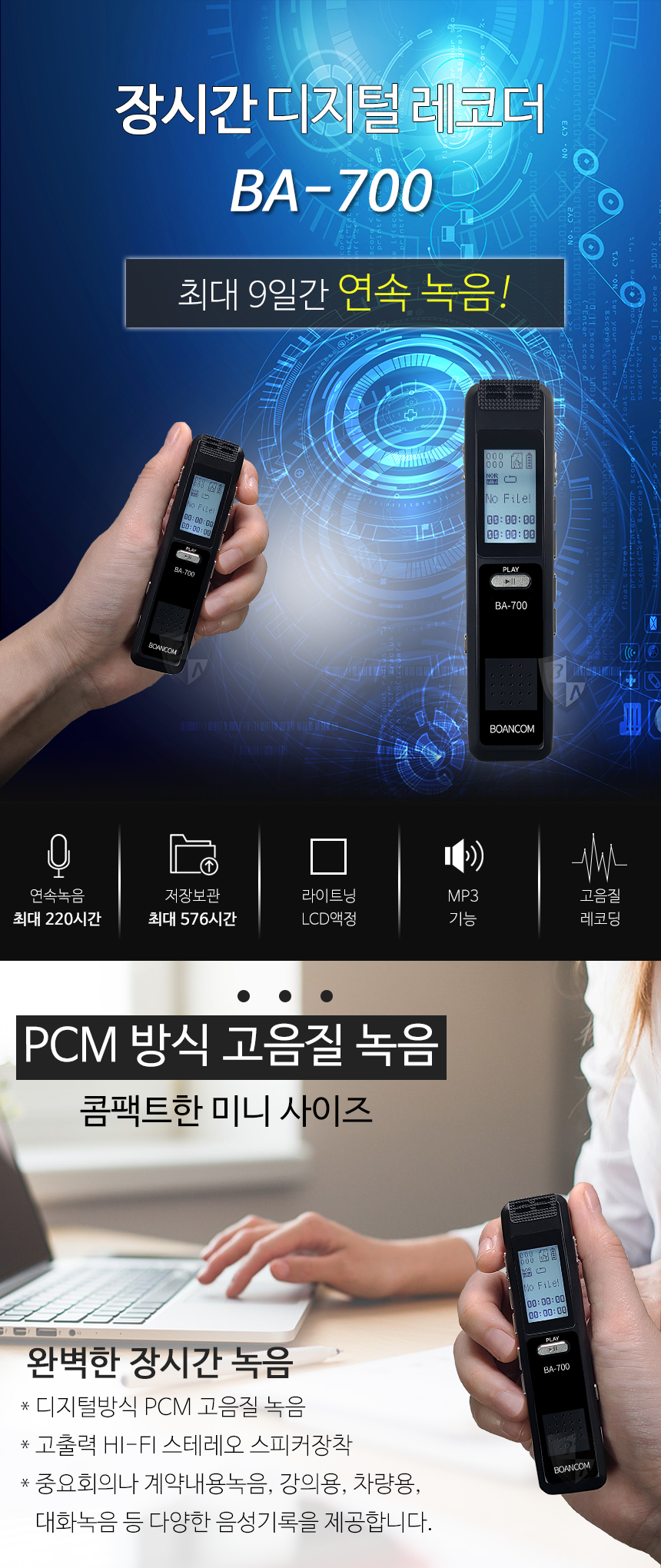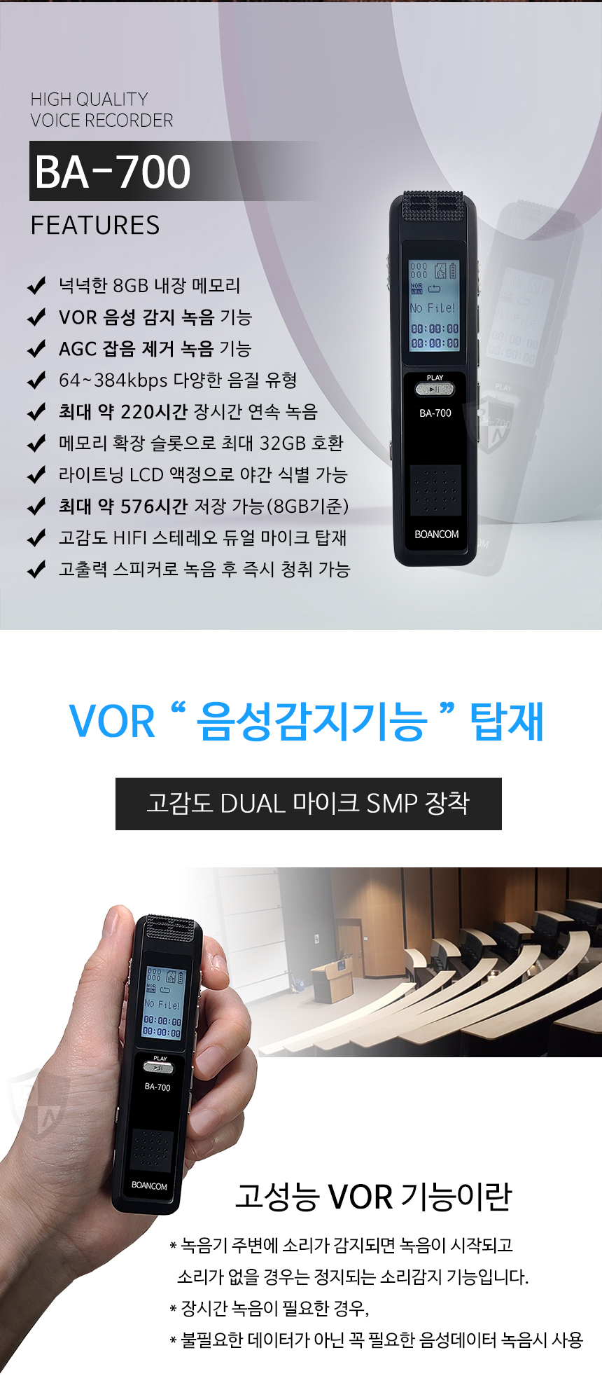 BA-700 9일간 연속녹음 음성감지녹음 잡음제거기능 음성증폭기능 첨단기능탑재