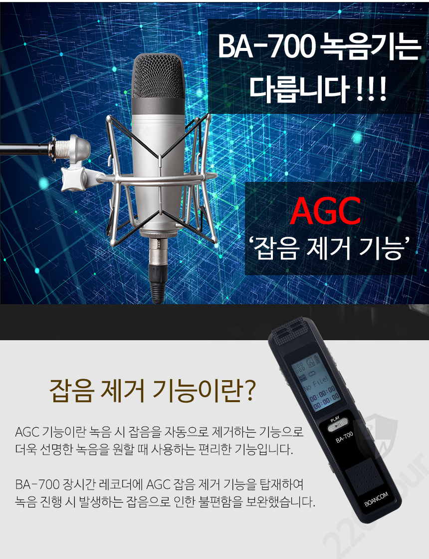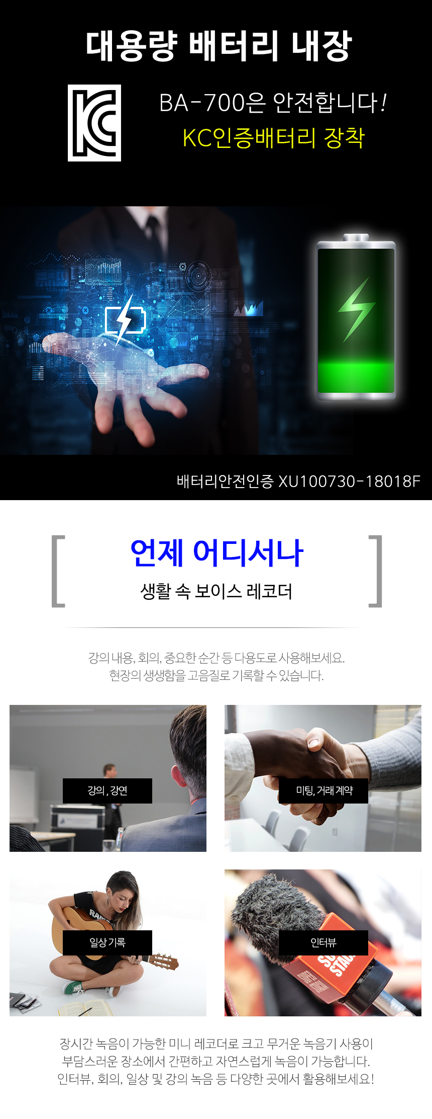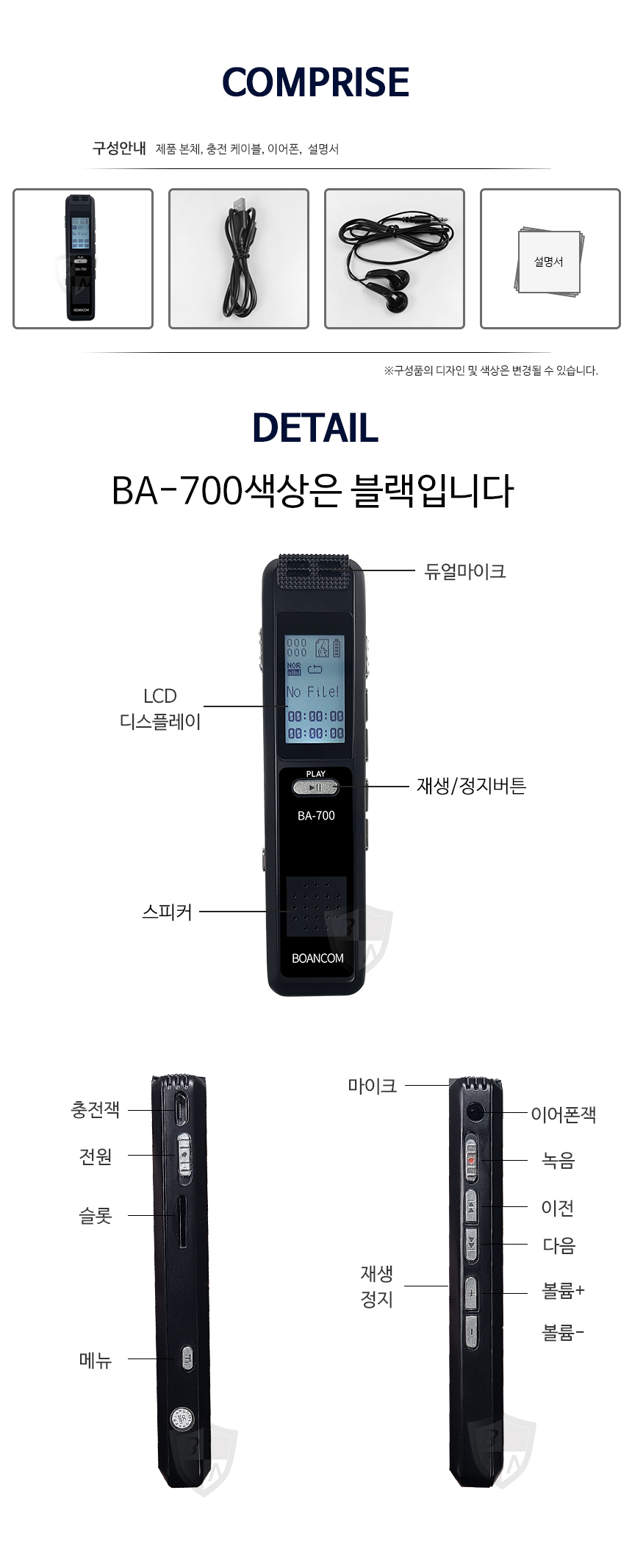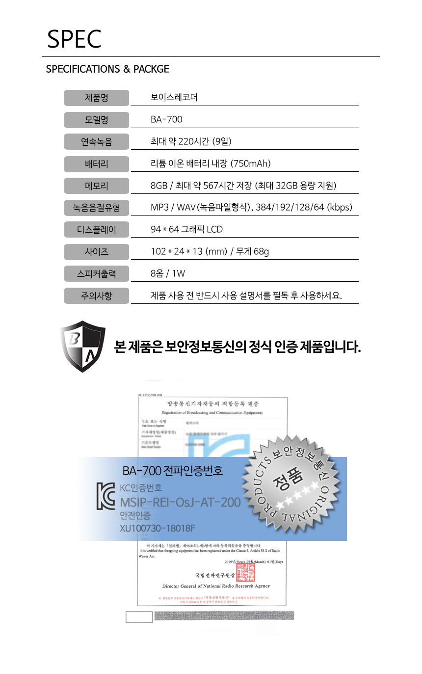 BA-700 9일간 연속녹음 음성감지녹음 잡음제거기능 음성증폭기능 첨단기능탑재