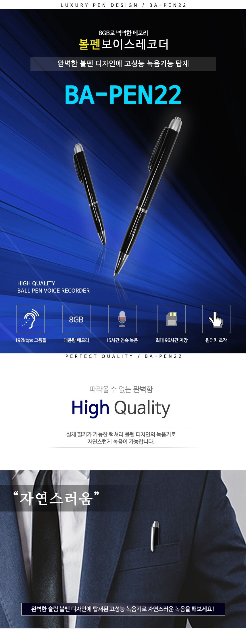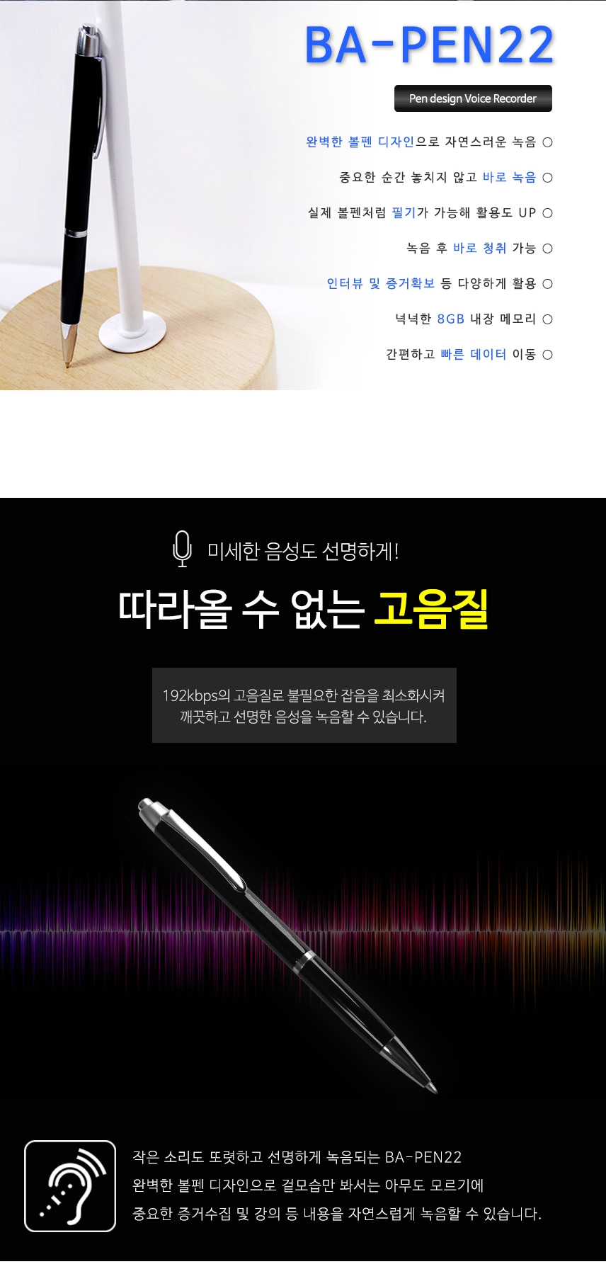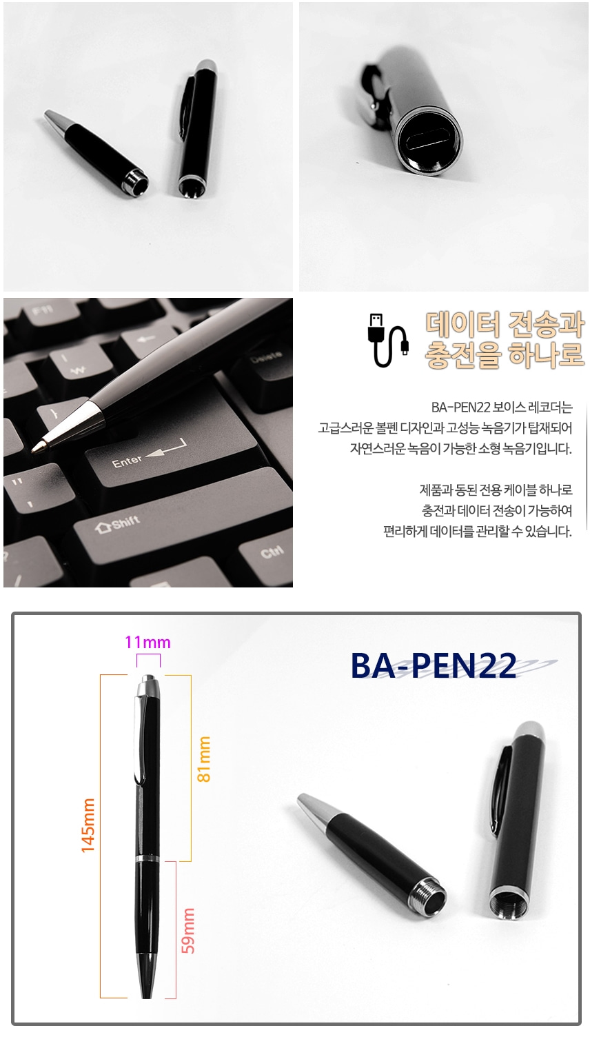 BA-PEN22 볼펜녹음기 고성능마이크 장착 15시간 연속녹음 위장형 특수형