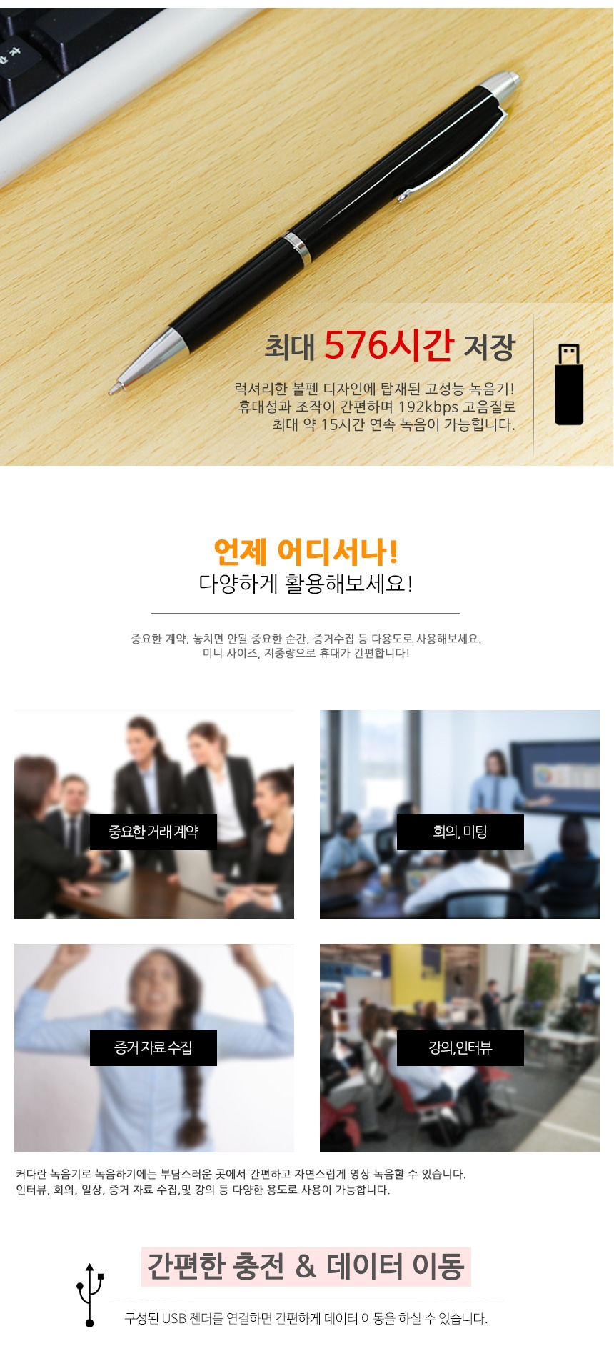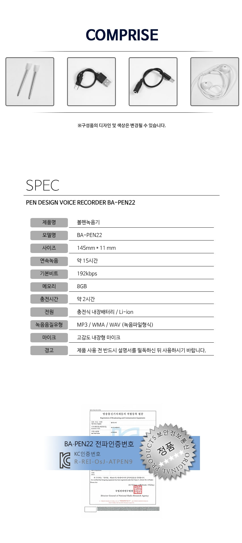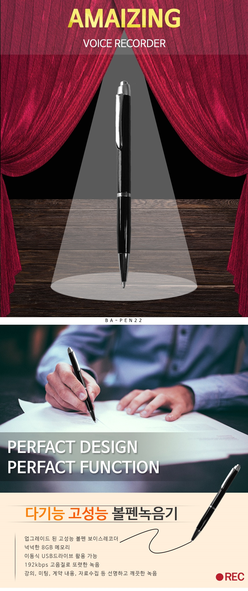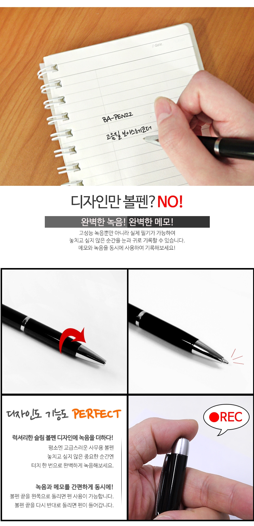BA-PEN22 볼펜녹음기 고성능마이크 장착 15시간 연속녹음 위장형 특수형