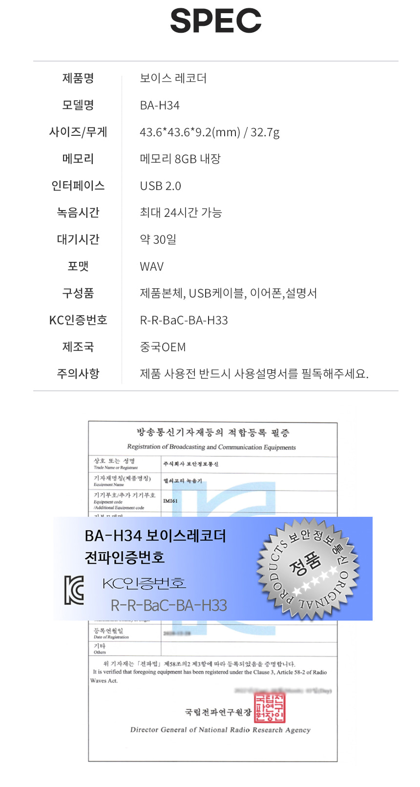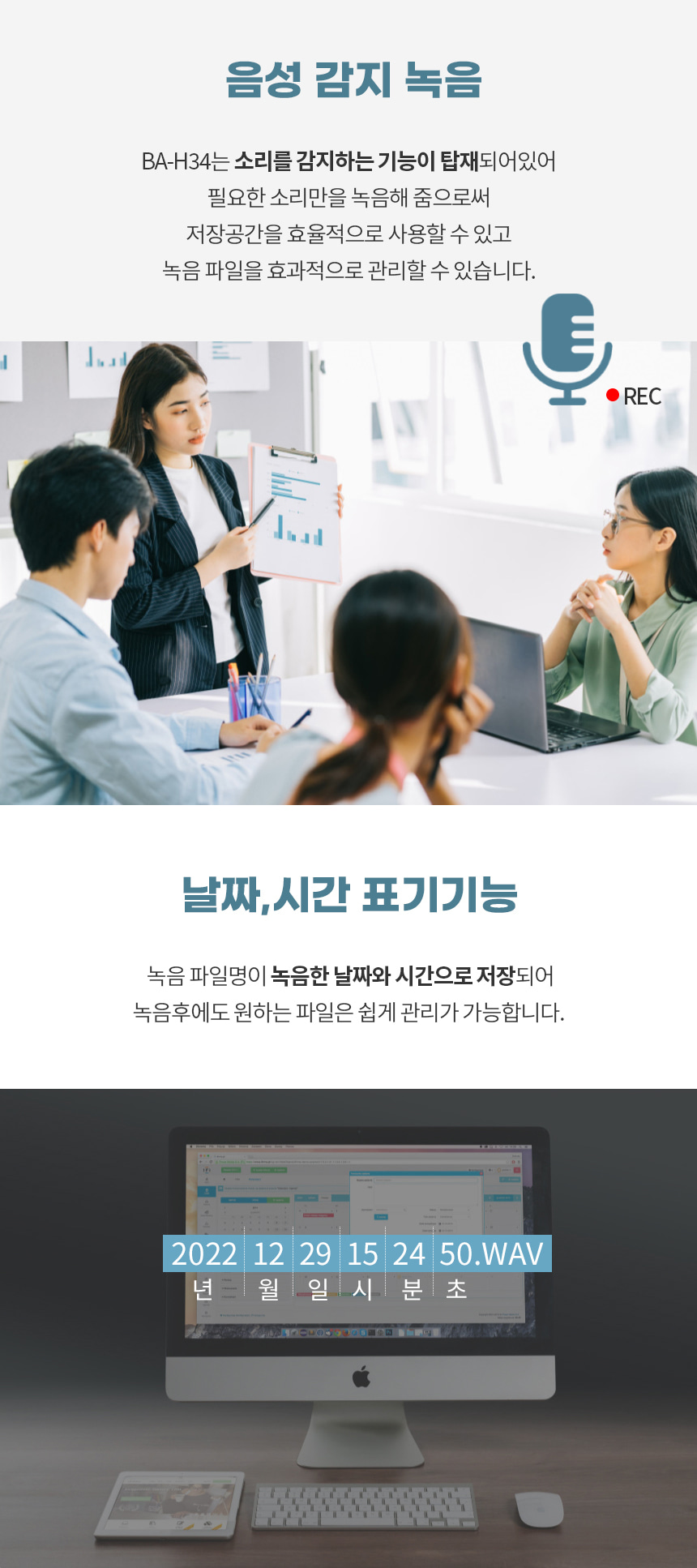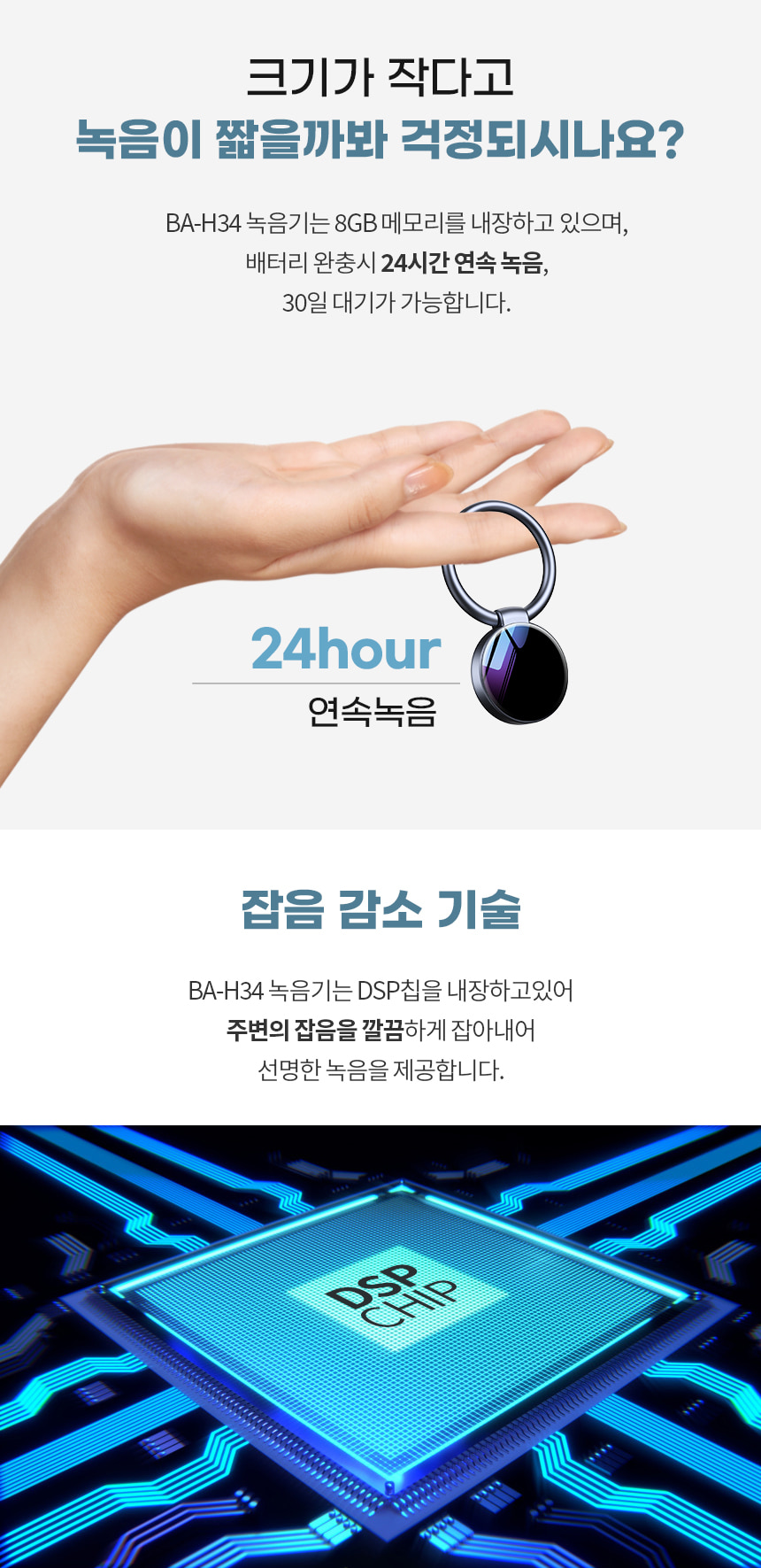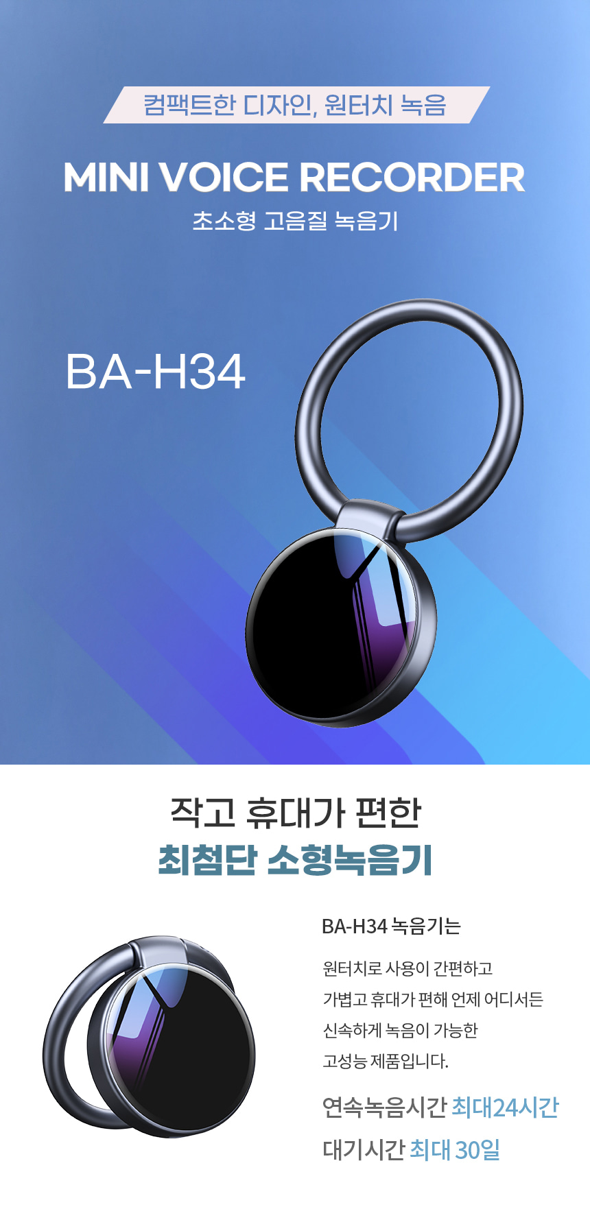BA-H34 소형녹음기 24시간 연속녹음 초간편 원터치방식 고성능마이크 장착