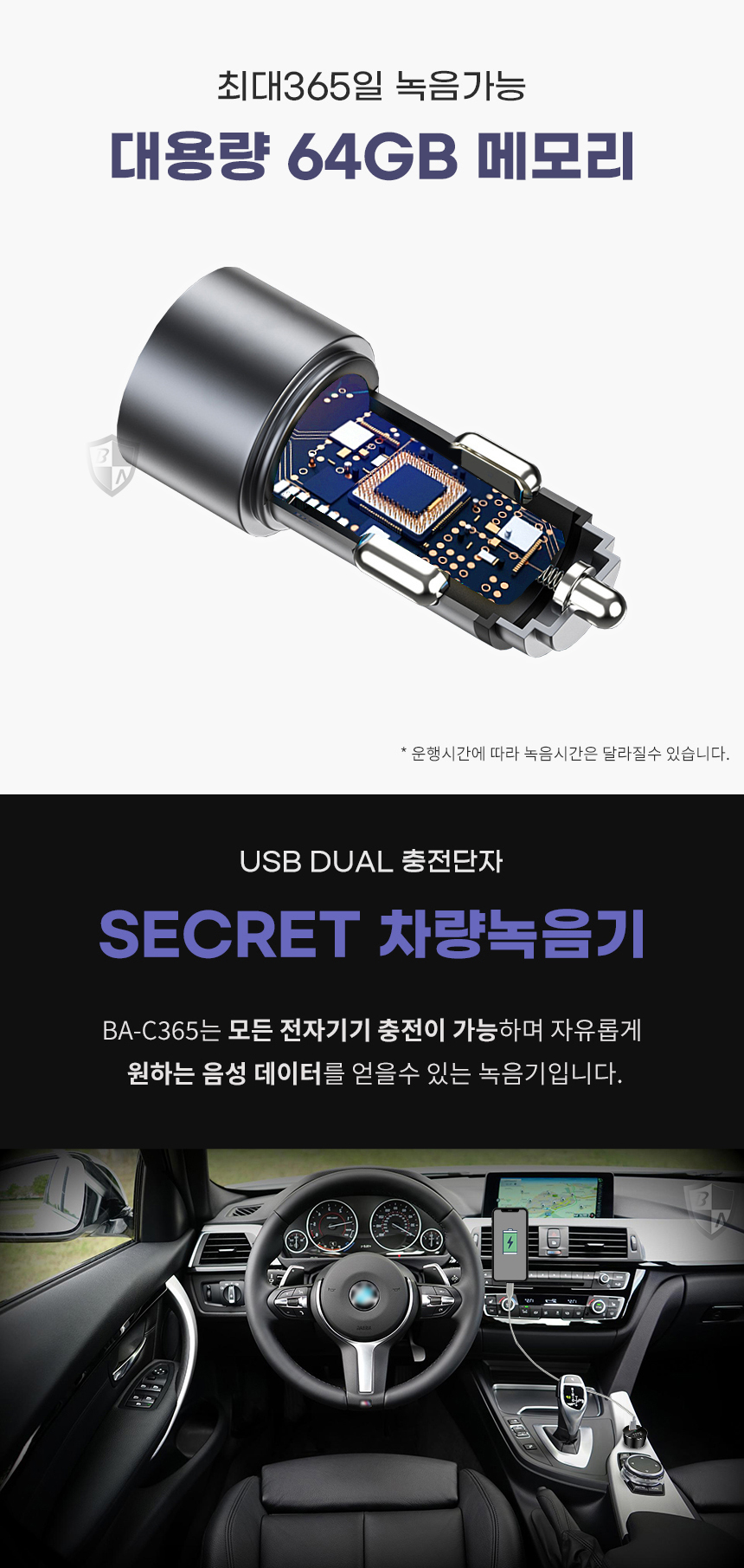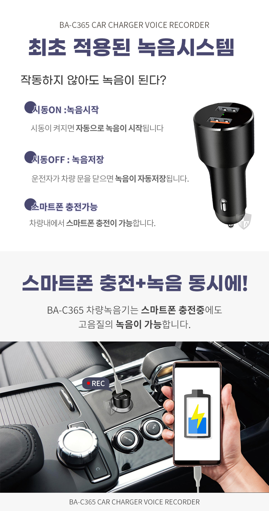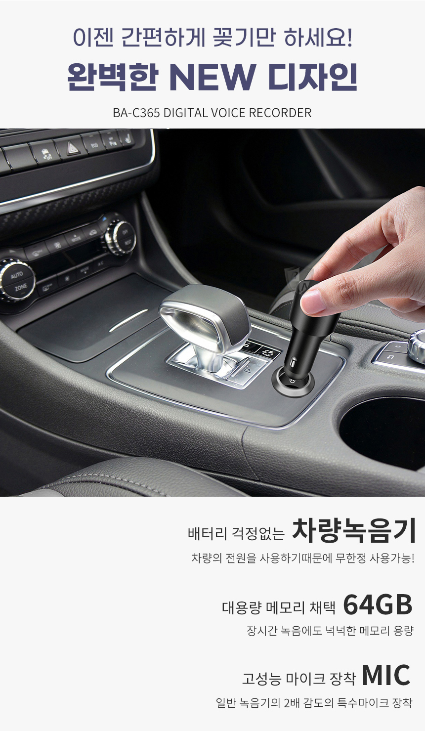 BA-C365 차량녹음기 최대1년녹음가능 대기시간무제한 차량시거잭 녹음기 초고음질마이크 장착